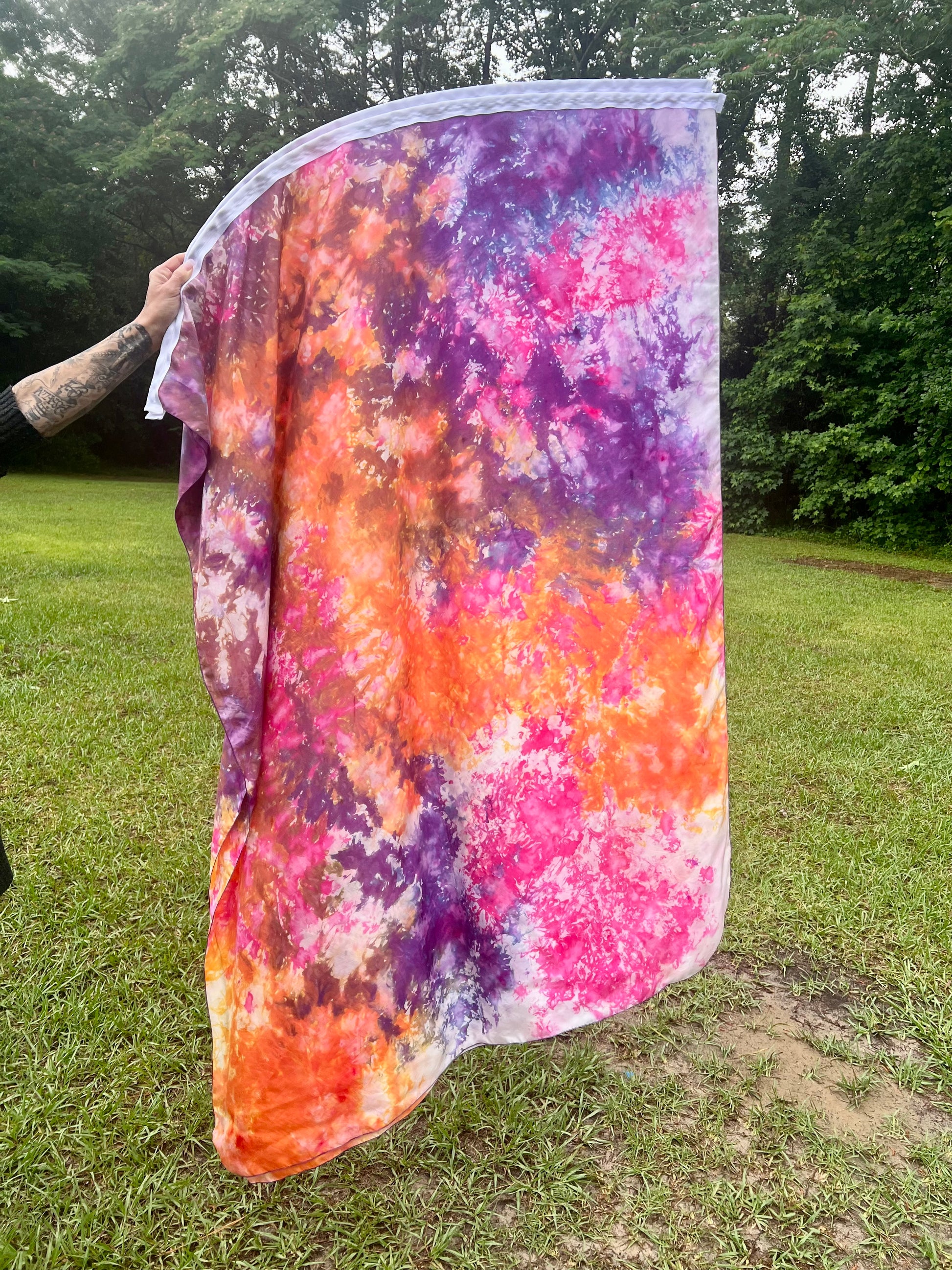 Joy Worship Banners, 100% silk on a flex rod. Measuring approximately 45in x 62in, handmade and ice dyed with the leading of Holy Spirit.